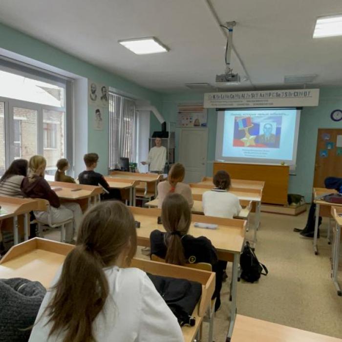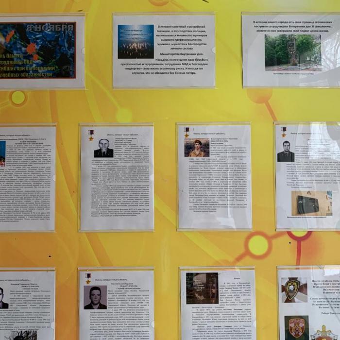 По случаю Дня Памяти, в гимназии «Арт-Этюд» силами 10Б класса и Венеры Вазыховны Темняковой подготовлен информационный стенд в фойе школы и проведен урок мужества «Герои нашего времени». В ходе урока старшеклассники познакомились с именами героев – сотрудников МВД России погибших при исполнении служебных обязанностей. Десятиклассники смотрели видео фрагменты по теме урока, выступали с докладами о судьбах людей, являющимися примерами для подражания.