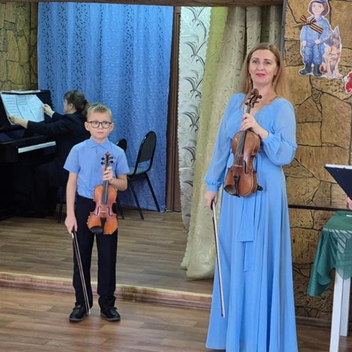 Концерт открыл трогательный дуэт юных скрипачей Козицина Настя-Мячев Савелий. А еще одно произведение они сыграли вместе со своим педагогом Татарчюк О.А.