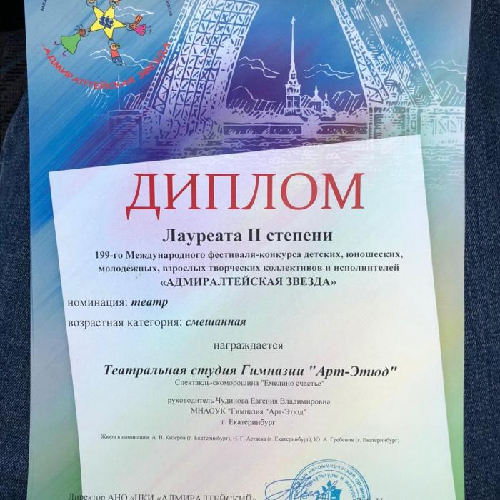 Спектакль театральной студии гимназии "Арт-этюд" сказка-скоморошина "Емелино счастье" получил дипломы жюри Международного фестиваль-конкурса «АДМИРАЛТЕЙСКАЯ ЗВЕЗДА».
