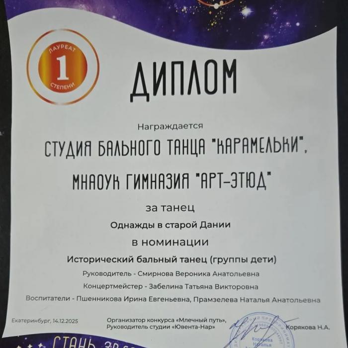 За танец «Однажды в старой Дании» коллектив «Карамельки» награжден Дипломом Лауреата 1 степени в номинации «Исторический бальный танец».