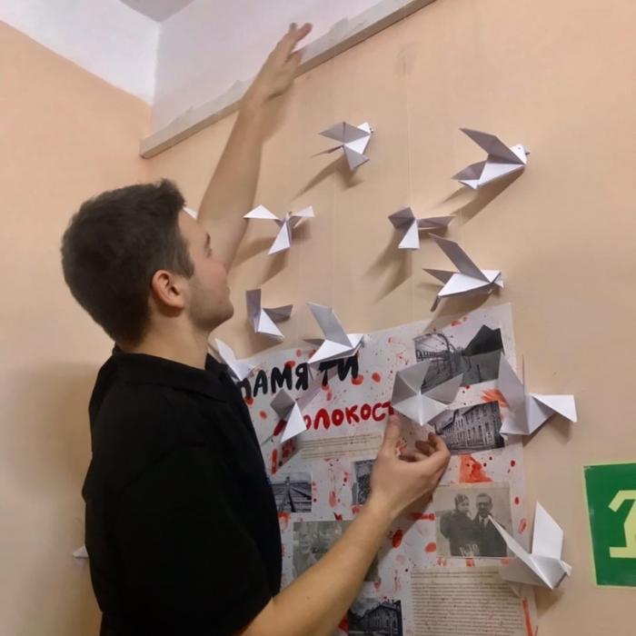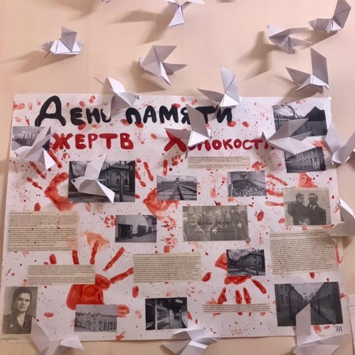 Ребята из 5х классов сделали поделки «Голубь Мира» из бумаги в память о жертвах Холокоста. Изготовленных голубей прикрепили к информационному стенду памяти, оформленному силами гимназистов 7 «А» и 10х классов.