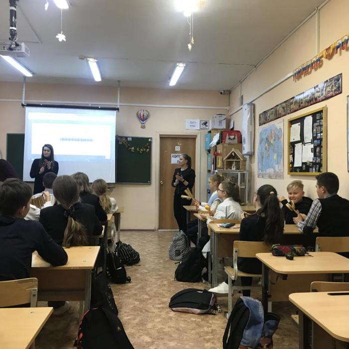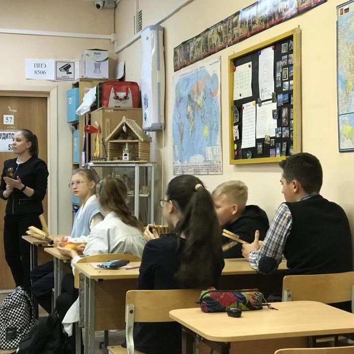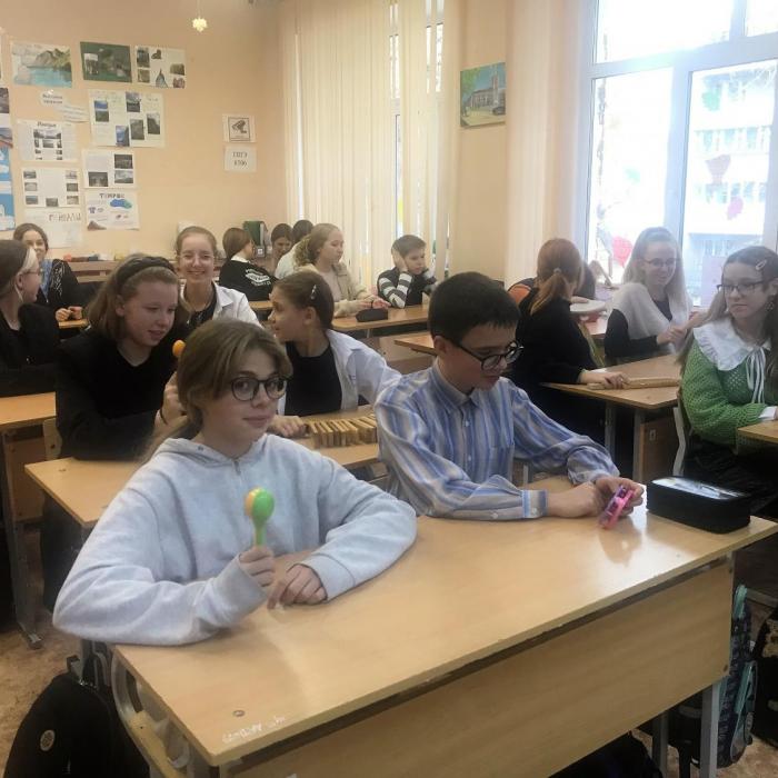 Для обучающихся 7 «Б» класса студенты – музыканты совместно с советником директора по воспитательной работе Марией Алексеевной Уфимцевой организовали музыкальный интерактив. Ребятам раздали музыкальные народные инструменты – ложки, бубны, трещотки и прочее. Было предложено повторить национальные мелодии народов России и поделиться своими впечатлениями.