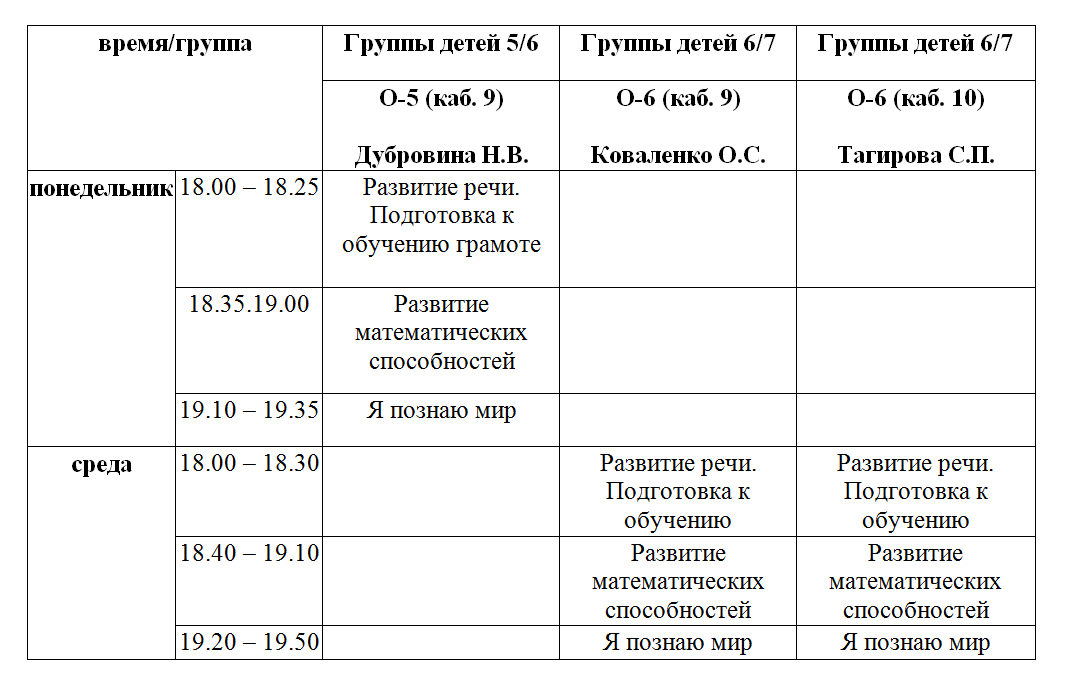 Занятия по средам (6-7 лет), учитель – Коваленко Оксана Степановна (каб. 9), Тагирова Светлана Павловна (каб. 10)