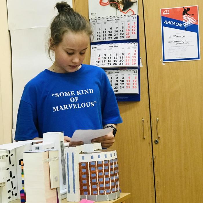 Помимо макетов существующих зданий шестиклассники предложили и собственные уникальные проекты. Никита Поляков придумал и создал футбольный стадион в виде мяча, Валерия Ковальчук спроектировала здание текстильной фабрики, Иван Владимиров продемонстрировал свой макет здания металлургического завода.