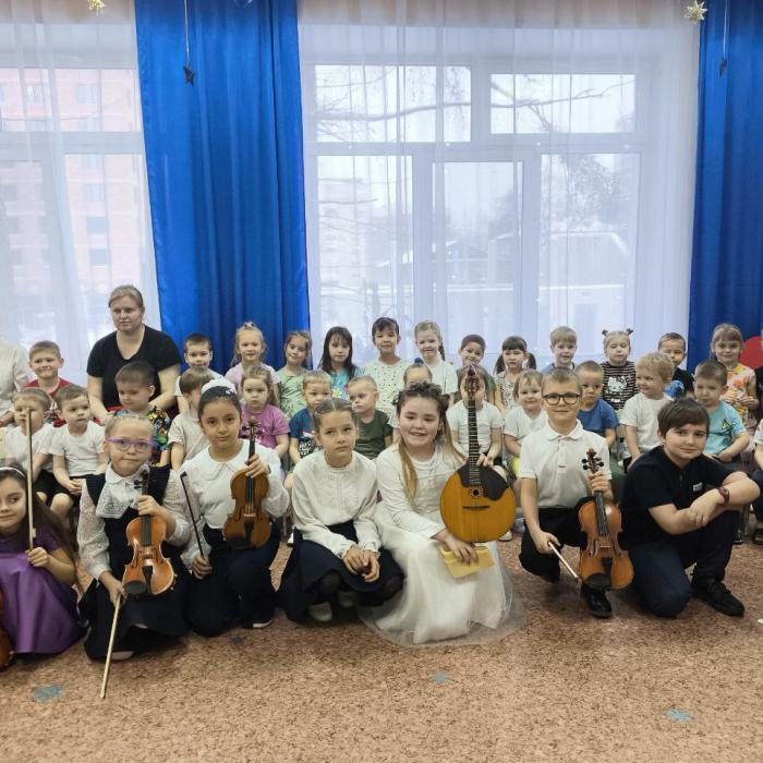 Юные музыканты познакомили малышей со своими музыкальными инструментами.В зале детского сада звучали домра, скрипка, баян и фортепиано.